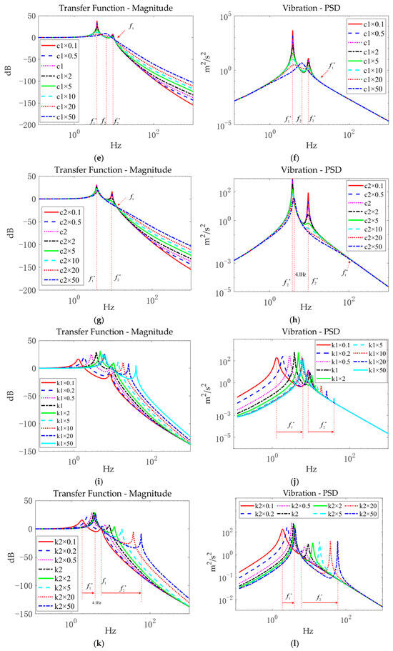 Figure 6i,j illustrate the FRC and PSD curves of as the multiplication factor of the first-stage spring stiffness () was varied from 0.1 to 50. Through theoretical calculations, the initial value of the high-frequency resonance () shown in Figure 6i was estimated to be 8.43 Hz. Furthermore, a static balance error warning occurred in the simulation when the multiplication factor of was lower than 0.05. and gradually increased as the multiplication factor increased from 0.1. When the multiplication factor was greater than 50, approached 5.37 Hz, which indicates that the low-frequency resonance frequency () of the DCSMS reached . According to the PSD curves in Figure 6j, although a new was introduced to the DCSMS, the energy of the high-frequency region decreased as the multiplication factor of increased.