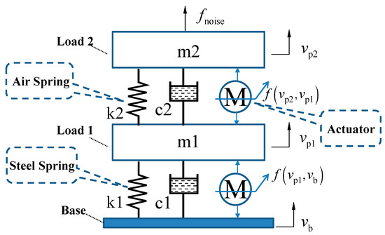 To streamline the calculations and facilitate simulation, steel springs were employed as the passive module to support the loads in the cascaded structure, disregarding . By analyzing the damping characteristics based on the vibration source propagation path of the cascaded system in Figure 7, it is possible to obtain the velocity transfer function between and under active control through the kinetic function of each stage:
