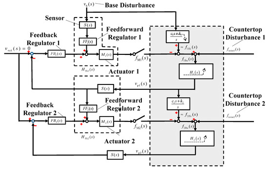 A degradation of the damping performance of cascaded passive systems is possible due to the coupling of intrinsic resonant frequencies [13], which can be readjusted and redesigned to facilitate the dispersion and absorption of the vibration energy to achieve a better vibration isolation effect [14,15,16,17,18]. Furthermore, the modal problems caused by structural coupling in cascaded passive vibration isolation systems and the constraint boundary problem for the transfer function of the multi-degree-of-freedom (MDOF) system in the frequency domain can be effectively solved by introducing the active vibration control technique [19]. Originally, pure feedback control was primarily employed to regulate periodic source vibrations [20] and enhance the performance of the cascaded vibration isolation system to a specified level in the presence of motor output saturation. The findings of [21] indicate that multi-loop feedback control outperforms single-loop feedback control in cascaded systems. Feedforward control is an effective method for isolating the impact of ground vibrations on precision instruments with multiple inputs and outputs [22]. An integration control strategy that combines feedback and feedforward control for precision instrument vibration control has been demonstrated in [23].