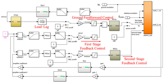 The following analysis and simulations of the DCSMS were based on dual-cascade tabletop feedback control and single ground feedforward control. Figure 9 illustrates the active vibration control model of the DCSMS. A 100-unit velocity white noise was applied to the foundation, while a 20-unit thrust white noise was applied to both stages of the tabletop. Different combinations of control modes can be achieved by varying the state of the single-pole double-throw (SPDT) switch in the model.