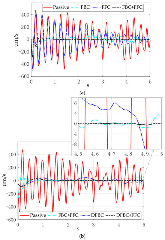 Simulation curves of DCSMS under active vibration control: (a) comparison of traditional control methodologies; (b) DFBC + FFC contrasts with the existing hybrid control methods.