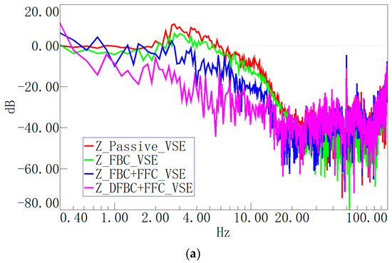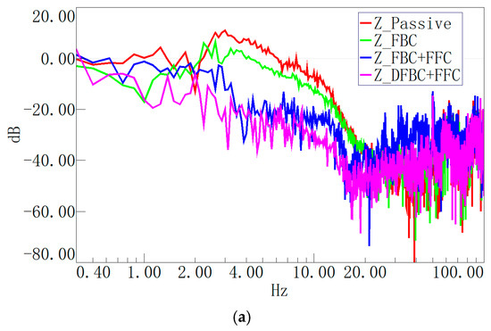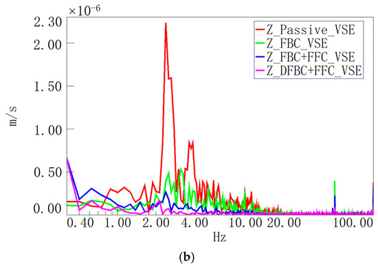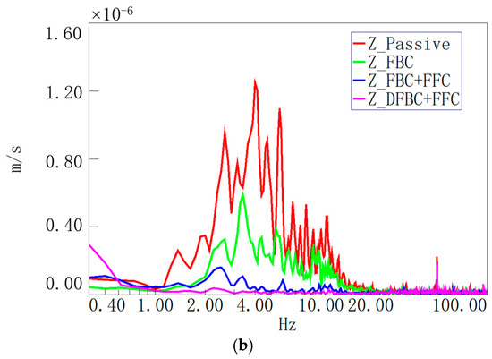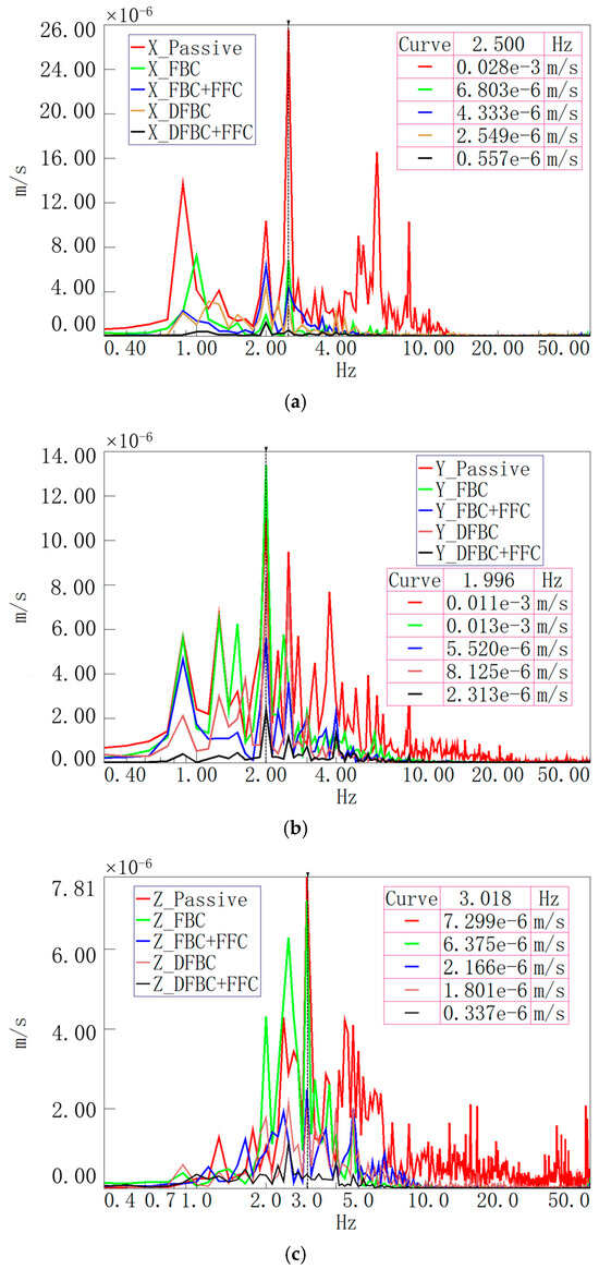 Furthermore, the external high-precision velocity sensors (VSE-15D-6) were used to validate the vertical test results to verify the data authenticity of the internal sensors. Figure 13a,b show that the DFBC+FFC control mode had a better vibration attenuation performance in the vertical direction compared to the FBC + FFC and FBC control modes.