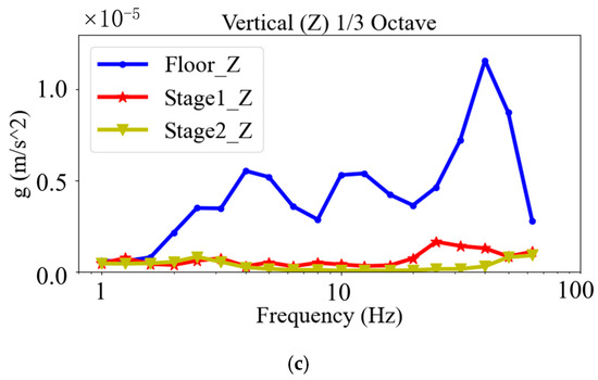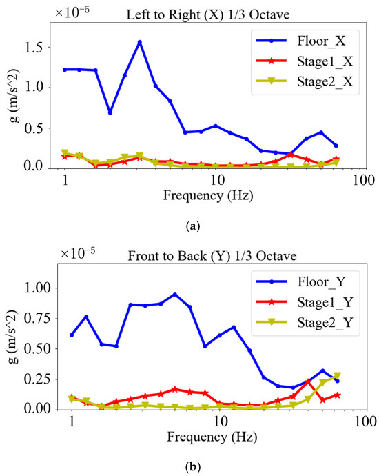 External 393B31 accelerometers were utilized at the designated points 1, 2, and 3 to ascertain the vibration characteristics of the apparatus in the X/Y/Z directions, as illustrated in Figure 14. The position marked 1 represents the ground vibration, position 2 reflects the tabletop vibration of the foundation, and position 3 indicates the vibration at the center of the support frame above the air springs.