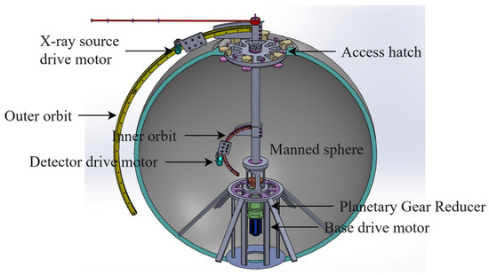 To achieve the complete 3D reconstruction and defect detection of the manned spherical shell, it is essential to obtain multi-perspective X-ray exposures of the entire structure. As shown in Figure 1, the system utilizes an integrated actuator drive mechanism based on permanent magnet synchronous motors. Coordinating three actuators—corresponding to the drive motors for the X-ray source, detector, and base—the system can scan the shell via independent or coordinated movements across three degrees of freedom. Concurrently, the control system modulates cathode signals to selectively activate multiple CNT-based distributed X-ray sources, capturing a greater number of angular exposures and detailed viewpoint-specific data once the relative positions of the source and detector are established. Both multi-actuator control and data communication are managed by an embedded controller, ensuring comprehensive system-level integration.