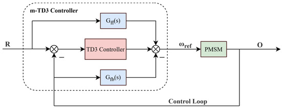 Let the transfer function of the TD3 controller be , and the transfer function of the motor part be simplified to ; that is, for the speed ring composed of PMSMs, there is . The output control signal formula of the m-TD3 controller is as follows: