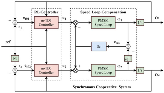 Leveraging PMSM control characteristics, a feedforward tracking controller is integrated with the position-loop reinforcement learning TD3 controller, while a feedback compensation controller is incorporated into the speed-loop feedback circuit. Together, these form the speed-loop control signal source, known as the m-TD3 composite controller. The system architecture is depicted in Figure 4.
