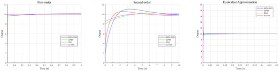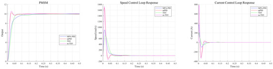 Table 5 shows the optimal parameter configuration and fitness values of MPA-optimized PID, the two-degree-of-freedom m-PID controller, and the m-TD3 composite controller after complete iterative optimization in the first-order unstable system, second-order complex unstable system, and equivalent approximate PMSM linear system. Figure 6 illustrates the variation trend of the fitness value with respect to the number of iterations. Based on the of the fitness function, a tiny parameter is added to prevent system instability caused by the parameter being too large. It can be seen in Table 5 that the m-TD3 composite controller has obtained the lowest fitness value in three different unstable linear systems, and it can be preliminarily assumed that the m-TD3 composite controller has the best control performance.
