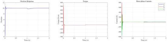 Figure 10 illustrates that upon the application of a load of at 1 s, the PMSM response exhibits a transient decline. The m-TD3 composite controller effectively mitigates this drop and rapidly compensates for the ensuing tracking error. Specifically, the maximum disturbance attenuation is approximately 0.261, with a compensation time of about 0.414 s. An analysis of the torque output further reveals that under no-load conditions, the torque tracking control signal stabilizes at zero during a steady state. Conversely, when a load disturbance is introduced, the controller promptly modulates the torque output to counteract the transient deviation and subsequently maintains a consistent torque level to re-establish stability. Additionally, the three-phase current outputs conform closely with theoretical predictions. These findings substantiate the robust control performance of the m-TD3 composite controller under load disturbances.