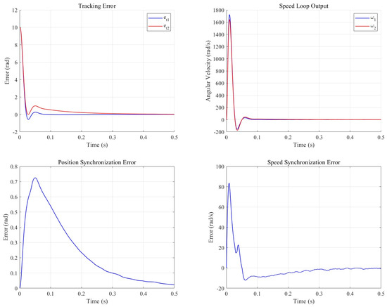 As illustrated in Figure 11 and Figure 12, the synchronous cooperative motion compensator effectively mitigated the motion discrepancies between the dual motors in the defect detection system. Specifically, the positional synchronization error was reduced by 92.4%, with its peak value decreasing by 88.3%, while the speed synchronization error was curtailed by 86.7% and its peak value by 40%. Furthermore, the compensator enhanced the tracking performance of the load-interference motor, as evidenced by a reduction of 0.05103 in its integrated absolute error (IAE), although the IAE for the no-load motor exhibited an increase of 0.04118.