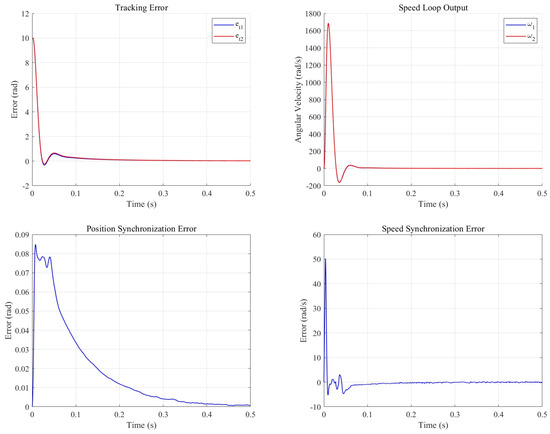 The synchronous cooperative motion compensator is set to 10, is set to , is set to 2, after CP-MPA optimization is 98, is set to 11,230, and the cooperative control model is built in Simulink. One of the two motors is a no-load motor, and the other is set to load . The control effect is shown in the subsequent figure.