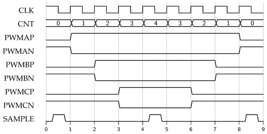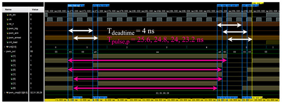 As for the timing parameters, the clock (CLK) frequency was set to 625 MHz, and the divided clock (CLKDIV) frequency was set to 156.25 MHz to achieve an optimal resolution. The PWM period and dead time were configured to 16,000 and 5, respectively, in accordance with the module parameters used in the experiments.