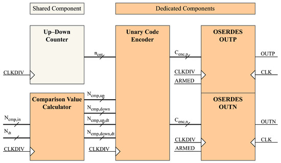 The unary code encoder takes the comparison values of all channels and splits them into two parts. The higher bits (most significant bits (MSBs) to three) are compared with the up–down counter value to determine when to activate the encoder. When the higher bits of the comparison value do not match the counter value, the encoder remains inactive, resulting in a constant output of either 0xFF or 0x00. This means the output stays entirely high or low during the counter clock period. When the higher bits of the comparison value match the counter value, the lower bits (two to zero) are encoded and fed into the OSERDES to fine-tune the output edge position.
