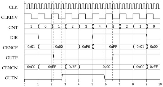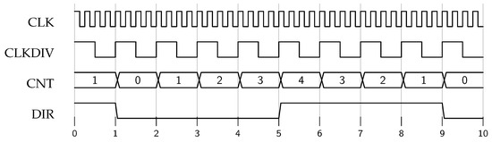 The up–down counter value continuously increments from zero to , then decrements from to one, forming a triangular carrier that serves as a time base, as illustrated in Figure 3. To ensure proper operation, must be a multiple of 16.