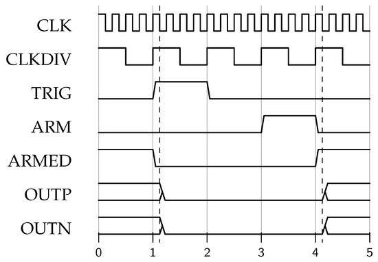 When the trigger port receives a failure signal indicating a fault condition like an overcurrent, the trigger signal is latched, and the OSERDES output is set to low after one CLK cycle. The output remains low for another CLK cycle after the arm signal arrives, which resets the triggered state to armed, as represented in Figure 6.