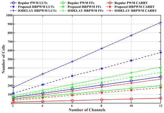 The slope of linear regression for the usage of lookup tables (LUTs), flip-flops (FFs), and carry chains (CARRY) per channel was used as a metric for resource utilization, as it quantifies the rate at which resource consumption increases with the number of channels. This approach provided a clear indication of how efficiently the proposed CA-HRPWM design scales as more channels are added.