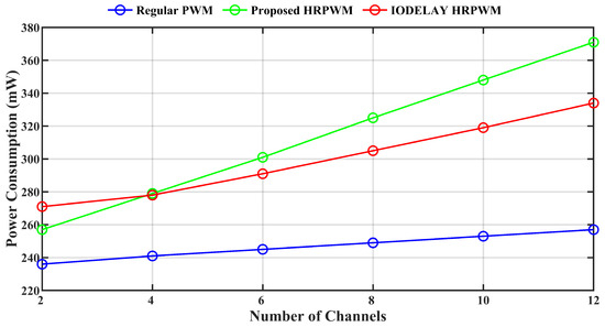 Power consumption per additional channel of conventional CA-PWM, IODELAY-based CA-HRPWM, and proposed CA-HRPWM.