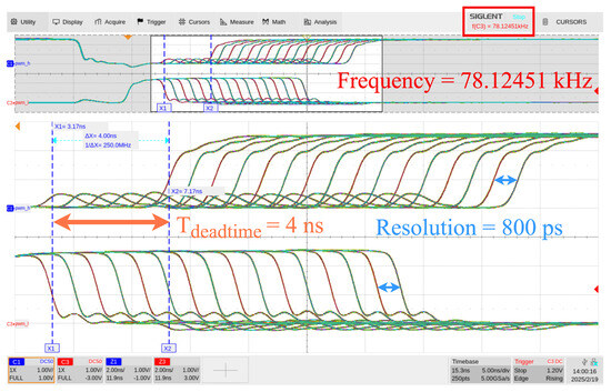 Figure 11 shows the time lapse of 5000 pulses with 16 consecutive comparison values for ranging from 9 to 24, with the period set to 16,000 and the dead time set to 5. Each step corresponded to 800 ps, so the cycle was and the dead time was . The measured 800 ps pulse width resolution, 4 ns dead time, and 78.12451 kHz frequency, verified by both the cursor and the hardware frequency meter, confirmed the proper functionality of the module and validated its high-resolution performance.