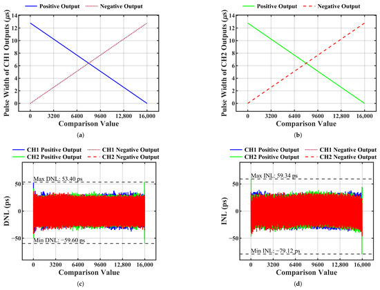 Pulse width characteristics of 2 different pairs of channels. (a) Pulse width of channel 1. (b) Pulse width of channel 2. (c) Pulse width differential nonlinearity (DNL). (d) Pulse width integral nonlinearity (INL).