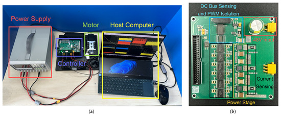 Experimental setup for PMSM current controller. (a) Overview of test equipments. (b) Details of power board.