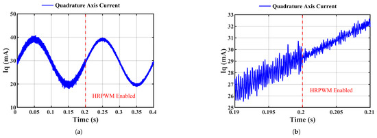 Measured quadrature axis current (). (a) before and after HRPWM was enabled. (b) Zoomed-in time scale.