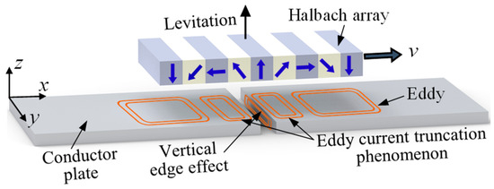 The PMEDS system comprises two primary components: permanent magnets (PMs) arranged in a Halbach array [27] and conductive plate guideways. When the PMs move above the conductive plate guideway at a specified speed, the strong magnetic field intersects the internal flux path of the conductive plate, inducing eddy currents within the plate. The magnetic field generated by these eddy currents opposes the variations in the source magnetic field, producing the levitation force above the conductive plate. This levitation force lifts the vehicle at a designated altitude above the guideway.