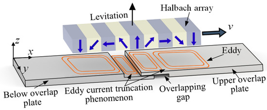 When the PMs operate within the continuous seamless region of the conductive plate, the induced eddy currents within the plate achieve a dynamic steady state, allowing the levitation force to remain balanced. However, in practical applications, the conductive plate length is always limited. This leads to straight seams where the eddy current is truncated, along with levitation force attenuation. This structure is illustrated in Figure 1 (hereinafter termed straight joint).