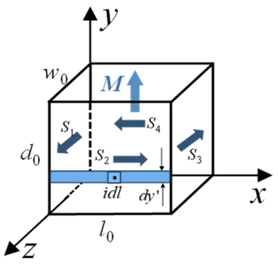 First, the surface current method is used to calculate the magnetic field of the permanent magnet. As shown in Figure 3, where arrow M is the direction of magnetization and arrows S are the direction of surface currents. This method utilizes the Ampere molecular circulation assumption to magnetize the permanent magnet vertically by assuming that it consists of a series of surface current magnetic fields. According to the principle of linear superposition, the magnetic field at a point in space is a superposition of the magnetic fields generated by each surface current element.