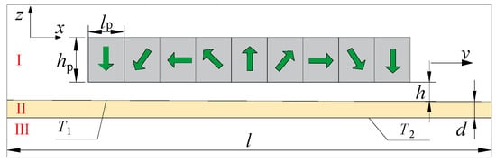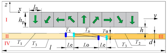 Figure 4 illustrates the PMEDS configuration with a complete conductive plate, where region I denotes the upper air domain above the conductive plate, region III represents the lower air domain beneath the conductive plate, and region II corresponds to the conductive plate itself. The geometric parameters are defined as follows: permanent magnet length (lp), permanent magnet thickness (hp), levitation height (h), conductive plate thickness (d), with T1 and T2 indicating the upper and lower surfaces of the conductive plate, respectively.