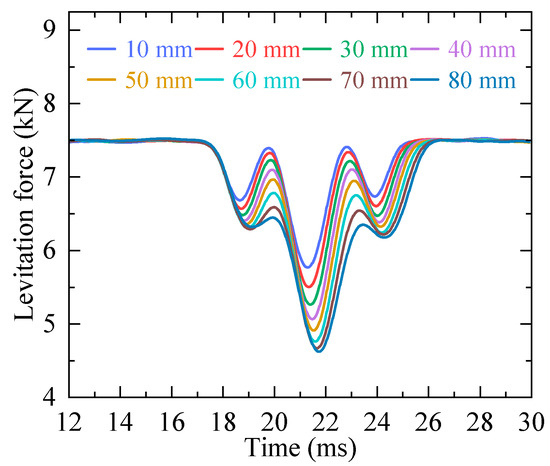 The initial analysis focuses on the straight joint model. The levitation force of this configuration is obtained by solving the partial differential equation in Equation (2) using finite difference method. Figure 6 presents the time-domain characteristics of the levitation force when the Halbach array traverses the expansion joint in the straight joint model at 250 km/h (Le: 10–80 mm). As the Halbach array crosses the expansion joint region, a sharp decay in levitation force is observed, followed by rapid recovery to baseline levels upon exiting. Specifically, each joint crossing induces at least two pronounced fluctuations in levitation force. Notably, weak longitudinal edge effects from the leading conductive plate during the Halbach array’s traversal result in slight asymmetry in the time-domain levitation force profile. When the Halbach array approaches the straight joint, abrupt magnetic field changes induce stronger eddy currents, akin to a sudden surge in friction during emergency braking. When moving away from the straight joint, although the magnetic field variation is symmetric, residual eddy currents require time to decay (similar to the gradual dissipation of residual heat after brake release). The difference in physical mechanisms between the “generation-decay” processes causes the force–time curve to exhibit a weakly asymmetric profile. As the Le increases, the magnetic field distortion zone expands, equivalent to prolonging the “brake pad contact time,” which amplifies the asymmetric characteristics. Through periodic extension of these fluctuation trends, the operational levitation force behavior can be predicted with enhanced accuracy. For straight joint guideways, long-term levitation force dynamics exhibit cyclical fluctuation patterns in the time domain.