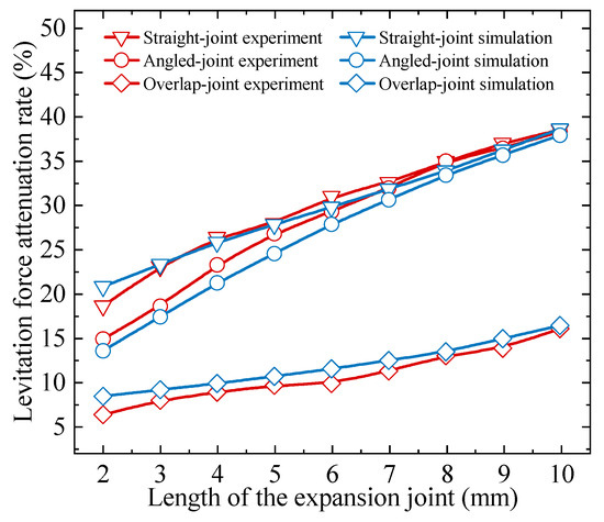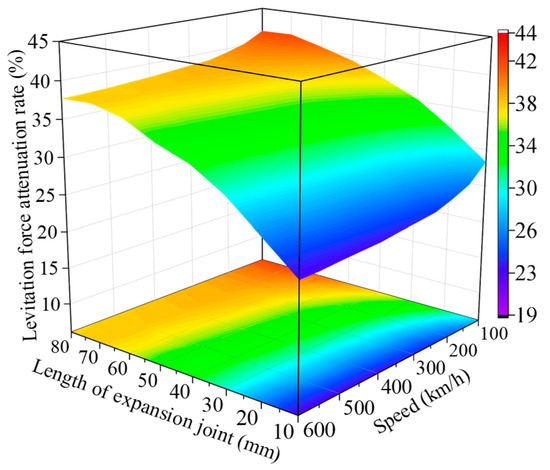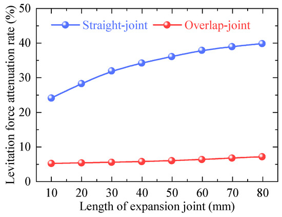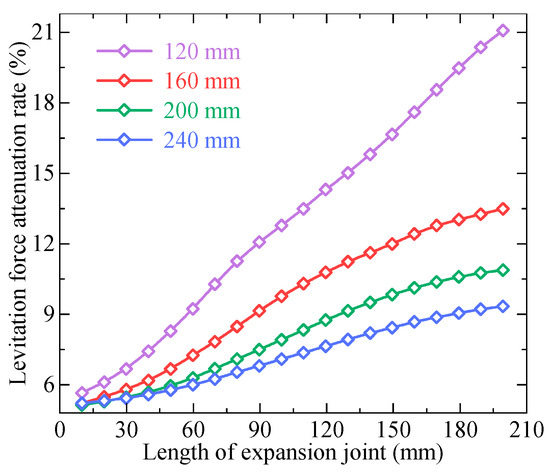 Evolution of the levitation force attenuation rate with the length of the expansion joint under different expansion joints.