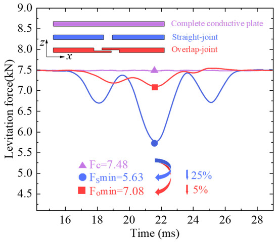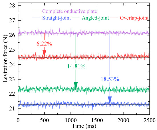 Figure 21 compares time-domain levitation force profiles for three expansion joint types (Le = 2 mm) against the complete conductive plate. A comparative analysis reveals levitation force reductions relative to the complete conductive plate baseline: (straight joint: 18.53% decrease; angled joint: 14.81% decrease; overlap joint: 6.22% decrease).