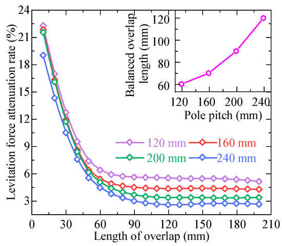 Evolution of the levitation force attenuation rate with the length of overlap in the overlap joint under varied pole pitches of PMs.