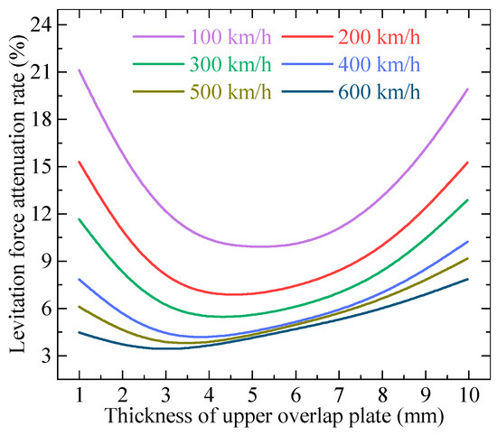 Evolution of levitation force attenuation rate with thickness of upper overlap plate in overlap-joint under different speeds.