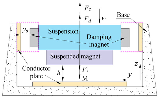 The vehicle incorporates damping magnets to address inherent weak damping characteristics, with structural configuration and force interactions detailed in Figure 14. Key system parameters include total mass (M):750 kg; levitation height (h); vertical vibration velocity (vz); levitation force (Fz); damping force (Fd); and expansion joint excitation force (Fe).