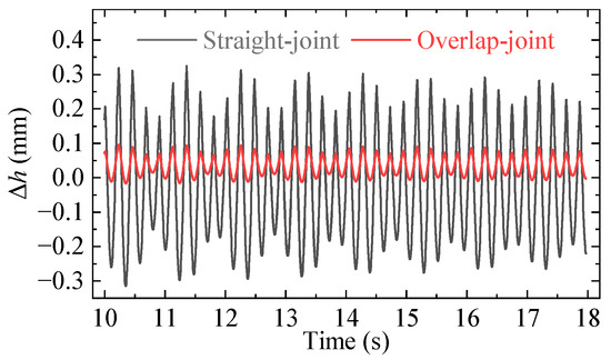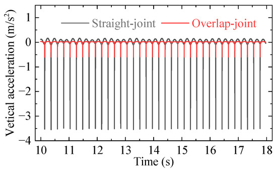 As shown in Figure 16, the Δh exhibits significantly reduced vibration amplitudes under overlap joint excitation (0.11 mm) compared to straight joint excitation (0.65 mm), corresponding to an 83% attenuation of vibration amplitude. Further analysis of vertical acceleration responses (Figure 17) demonstrates a substantial mitigation of peak acceleration values from 3.65 mm/s2 (straight joint) to 0.6 mm/s2 (overlap joint), achieving an 81% reduction.