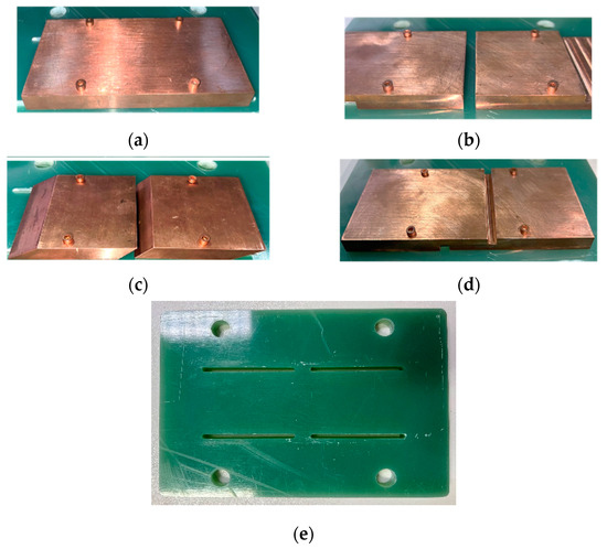 Conductive plates of different expansion joints and support plate: (a) Complete conductive plate; (b) Straight joint; (c) Angled joint; (d) Overlap joint; (e) Support plate.