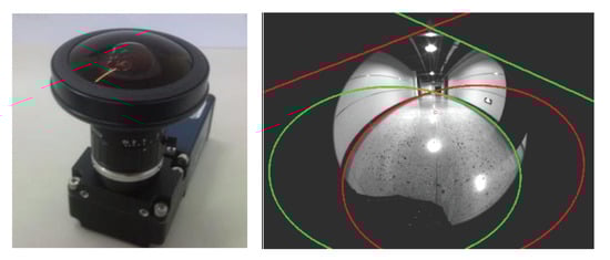 Figure 1 demonstrates the catadioptric camera and its corresponding images captured in a corridor environment. The image lines corresponding to 3D straight lines on the floor are seriously distorted by the camera fisheye lens. With a unified projection model [], it is possible to approximate its imaging process and utilize some specific properties of the image line projected from the 3D line, which are desirable for robot IBVS-based corridor-following. Based on the conic fitting algorithm [] and a modified RHT method on a sphere [], the projective curves as well as their polar lines can be extracted, as shown in the right picture of Figure 1.