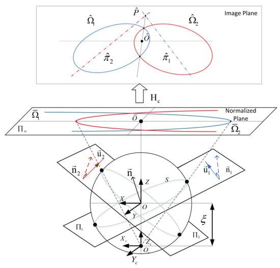 As shown in Figure 2, a unified central projection model of a catadioptric camera has two frames, O and , where O defines the center of a virtual unit sphere, and represents a new projection center with coordinates in relation to O, where represents the translation along the Z-axis between these two frames. According to the unified central projection model, a 3D straight line L will be sequentially projected into the unit sphere in relation to O, and then into a conic curve in relation to .