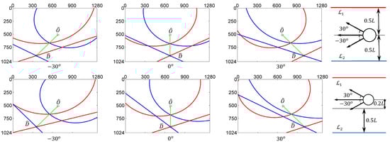 In Figure 4, we present the simulated line images and corresponding polar lines calculated from two horizontal 3D parallel lines and when the robot is placed in the corridor with different poses. The distance between and is L. The first three columns of Figure 4 demonstrate two projected line images represented by (blue and red) conic curves, (blue and red) polar lines in relation to pole of two curves, and intersection of two polar lines in the normalized image plane when the robot rotates in three directions at different positions in the corridor. In the top row, the robot is situated in the middle of the corridor; as it rotates from to , translates from left to right, with y of remaining unchanged, so that each image in the bottom row also has a similar observation. This proves the previous motion result of . Another point is when the robot is situated in the middle of and , with ; the left and right conics and polar lines will be symmetric with respect to , respectively, while this is not the case in the bottom row when since there is a slight offset from the middle point of corridor.