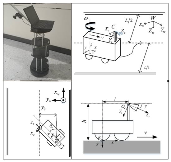The camera pitch angle . The camera center is with respect to the robot center. The width of the corridor is L. The height of the camera is h. The transformation matrix between the camera and robot frame is calculated by