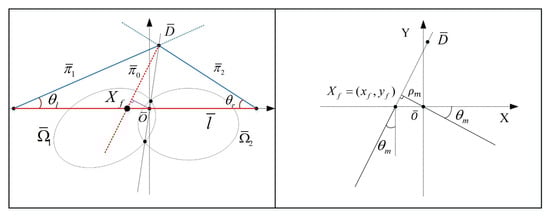 of two polar lines and is closely related to robot pose. As shown in Figure 7, , , and a horizon (red) line segment passing through are chosen as three edges of a triangle in . Let be the line segment passing through , and be the median point of .