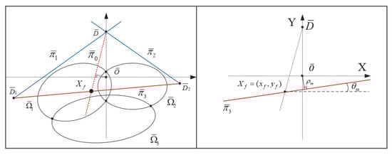 Choose the projected center in as the pole of ; from Equation (4), the polar line of in relation to is