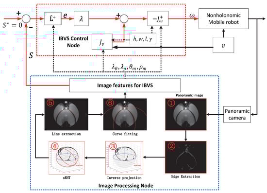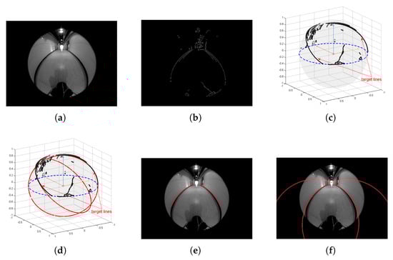 We developed our IBVS system under a ROS (Robot Operating System) by using Visual Studio Code on Ubuntu 16.04. The system integrates two additional nodes, the image acquisition node and IBVS node, respectively. As shown in Figure 16a, the former node grabs the catadioptric image from camera. The latter will subsequently detect the edge pixels by using a Canny edge detector (Figure 16b), and then adopt a modified line image detection algorithm based on [] to generate the control value for robot motion. In this approach, all the edge points are inversely projected onto a unit sphere, and the target projected line image pixels will lie along the corresponding two great circles on the sphere, as shown in Figure 16c; we then use a Randomized Hough Transform (RHT) to cluster the great circles and generate the candidate great circle (red one) for each target spatial line, as shown in Figure 16d. In Figure 16e, we present two detected line images overlapped by red curve segments for two reference lines on the ground. As shown in Figure 16f, these two segments are fitted into two conics based on the research [], and the corresponding polar lines are calculated for point , which are then used to control robot motion; the whole control cycle of our IBVS system is about 10 Hz.