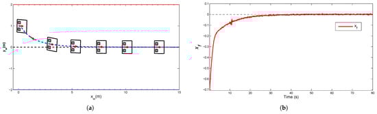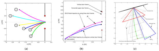 As shown in Figure 14a, the doorway in our simulation is represented by three door frames, two vertical 3D parallel lines (red points) and an upper horizontal door frame that connects these two points; the parameter equations of the vertical lines are and , respectively. Other parameters for the IBVS algorithm are the same as for the previous corridor-following task, and some initial robot states are shown in Table 3. By using these three lines, it is possible for a robot with different given initial poses to approach the target door center. The final error with respect to the middle of the door for each trajectory is presented in the last row of Table 3, and the deviation may be closely related to the given initial since the errors from ① or ⑥ are comparatively larger than those from other initial states (②, ③, ④, or ⑤).