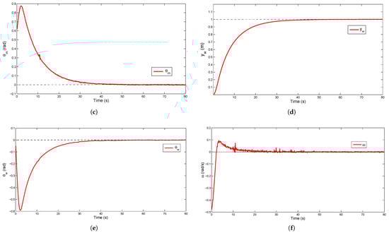 Our IBVS system is based on the ROS framework, which is not a real-time system, and we do not optimize the image processing part of the IBVS node to deal with environmental disturbance, so that observation noise and a processing delay will inevitably be introduced. Therefore, in practice, it can be seen from Figure 18 that curves corresponding to and are accompanied by obvious disturbance, and the convergence speed is slow. However, our IBVS node still generates a damped oscillation output and manages to guide the robot approximately to the middle of the corridor.