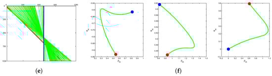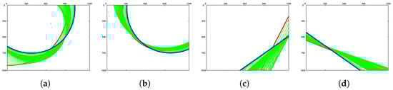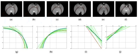 In Figure 19, we illustrate the processed images with detected curve segments (red curves) at positions from (a) to (f) in Figure 17. Observations of detected curves reveal that these two curves may change from initial deflection to approximate symmetry with respect to in the image. We also demonstrate the changes in left and right conics for the reference corridor lines (in Figure 19g,h) and their corresponding polar lines (in Figure 19i,j) in the image. The red curves in each figure are initial image features at (a) in Figure 17, the blue curves represent the image features when robot arrives at (f) in Figure 17, and the green ones correspond to the feature transactions from the initial state to final state. It can be seen that, in final state (f), the left and right image features tend to be symmetrical with respect to as the robot moves to the middle of the corridor.