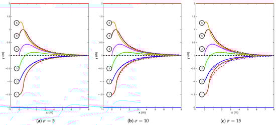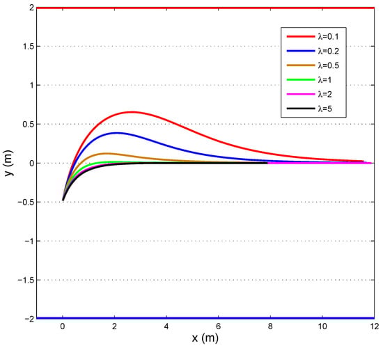 In our IBVS method, the lower bound of allows the convergence of our control law. To test the influence of parameter on the control law in Equation (28), as shown in Figure 13, we present a simulation in which different values of parameter . We keep the robot with the same external conditions, including initial pose, robot velocity, camera parameters, and image noise, and then the convergence speed only depends on . The robot trajectory with different reveals that the increase in makes it tend to steady state more smoothly and quickly. It can be seen that may lead to the overshoot of the system, and nearly coincide, and the rise time is a bit longer than . Therefore, in our IBVS system, is good enough for our corridor-following task.