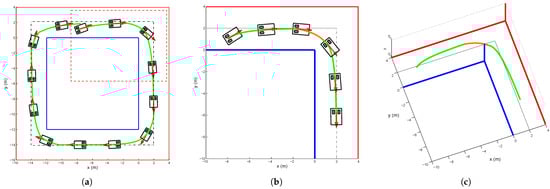 IBVS simulation in a closed-loop corridor. (a) The whole robot trajectory. (b) Magnified top view. (c) Three-dimensional viewpoint of the first corner.