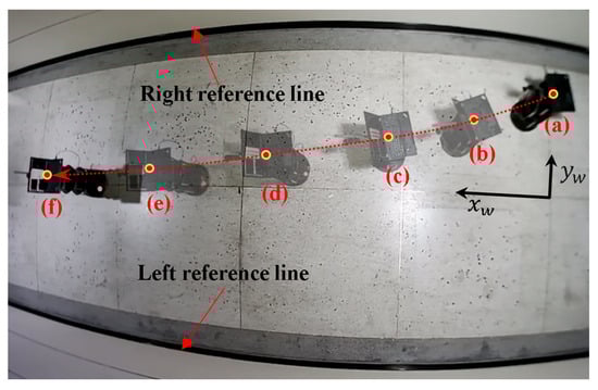 As shown in Figure 17, we choose two-sided black lines of the corridor as reference parallel lines to control robot motion. The robot is firstly placed at point (a) with initial pose m, , and then it is gradually guided towards the middle line of the corridor by our IBVS algorithm. We demonstrate this trajectory marked by a red dotted line, and the translucent robots overlapping on this path from (b) to (e) are some recorded robot images for clarity. It can be seen that this trajectory is similar to the previous simulation result; the robot approximately reaches the middle line and the heading direction is nearly parallel to the reference line.