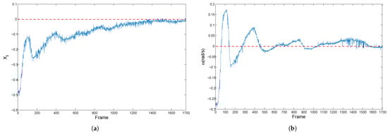 As shown in Figure 18, we present visual feature curves for the IBVS controller and the corresponding controller angular velocity output . The two curves of the whole control procedure are accompanied by a small range of noise, and experiences a damped oscillation procedure; however, as a whole, and go towards 0 gradually.